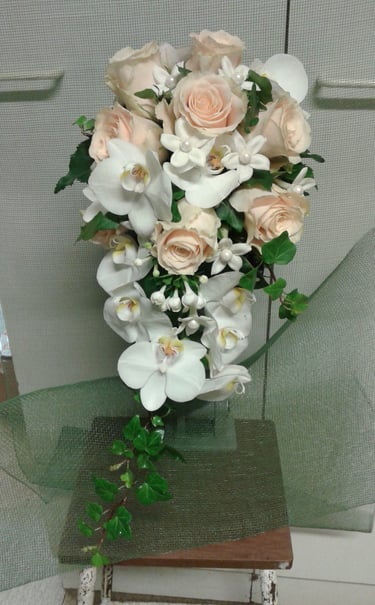 Hääkimppu, ruusu, orkidea ja bouvardia.