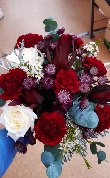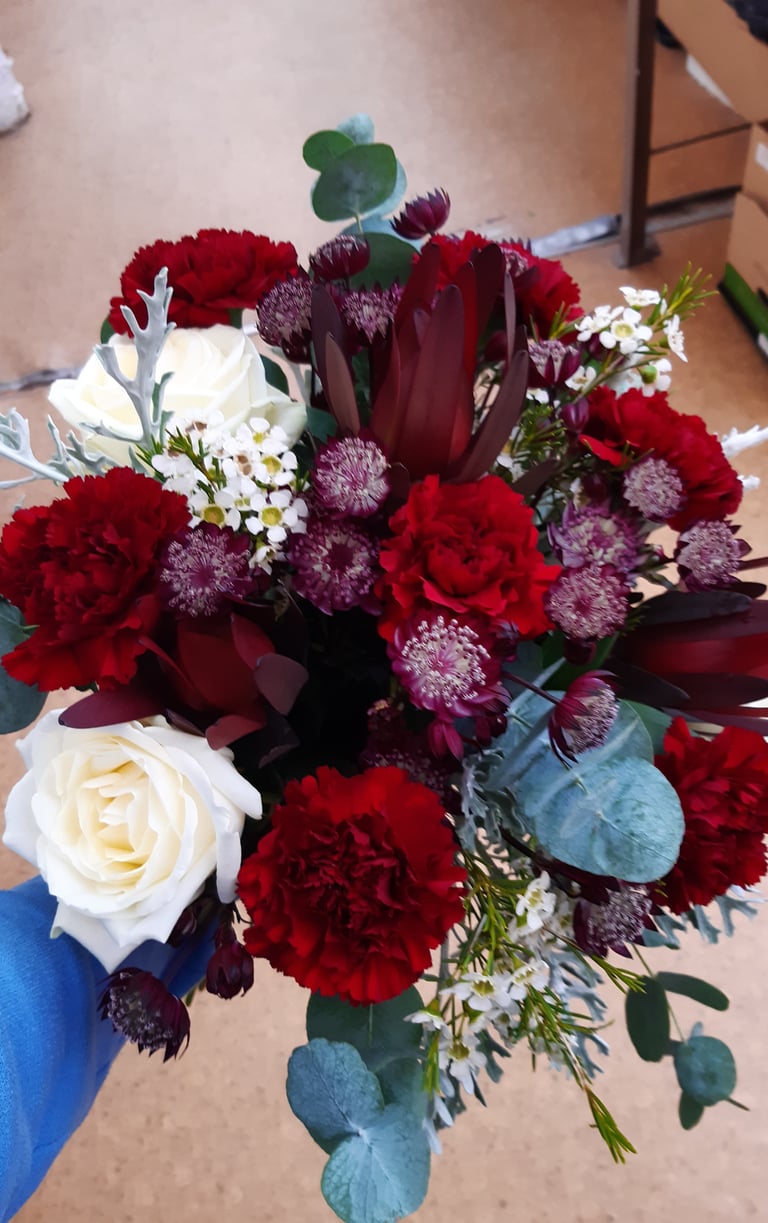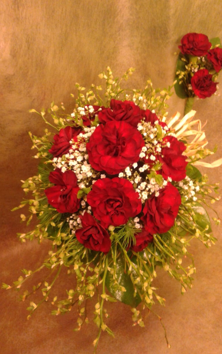 Hääkimppu, neilikka, tähtiputki, vahakukka, ikilatva ja ruusu.