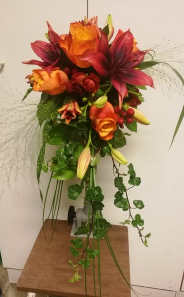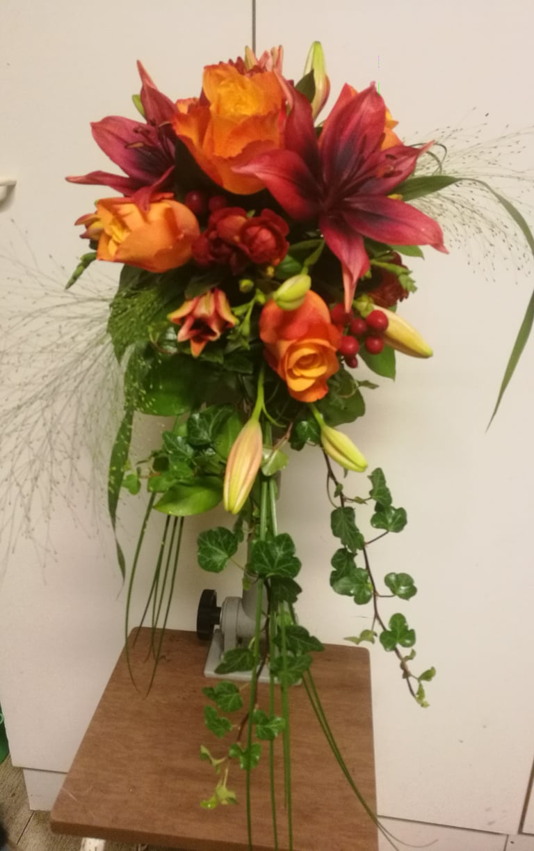 Hääkimppu, värililja, ruusu ja marjakuisma.