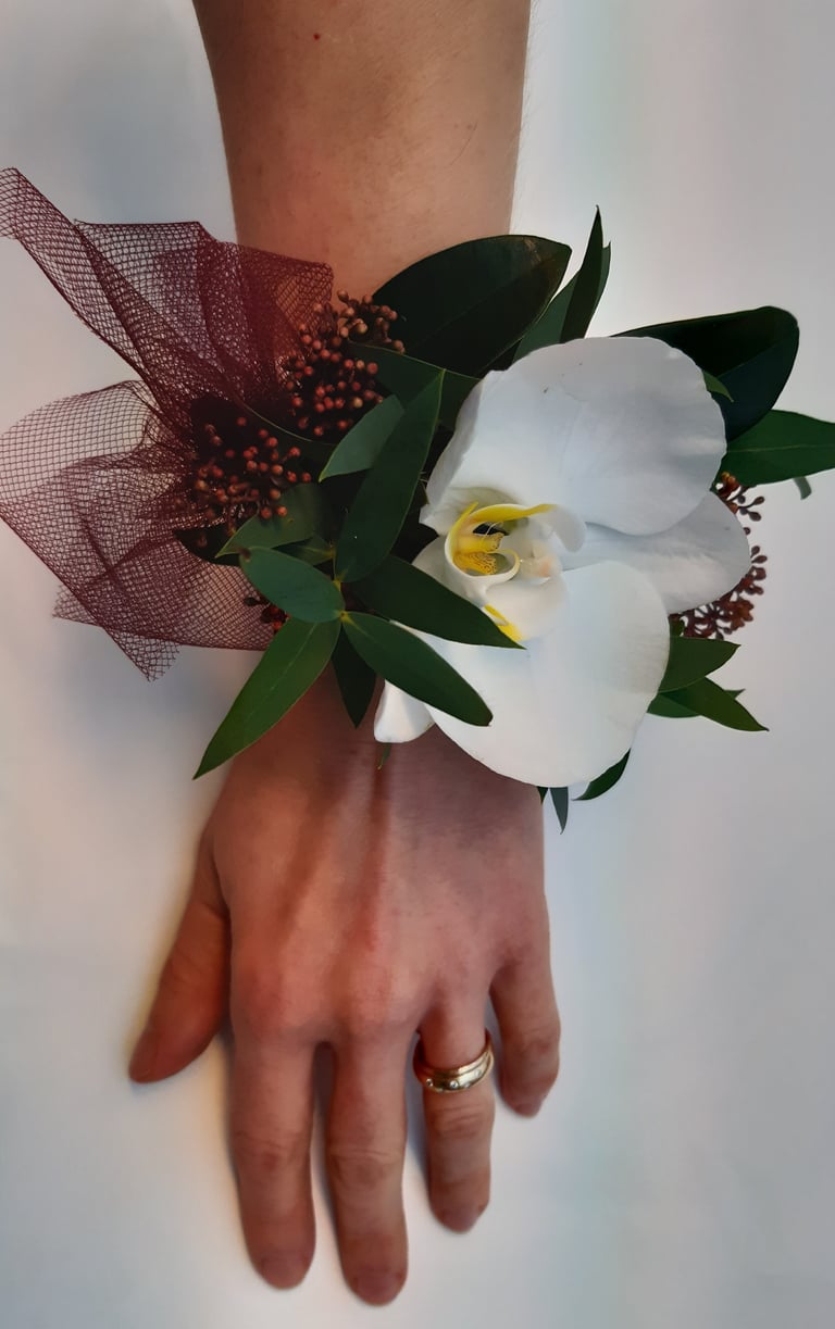 Morsiusranneke, orkidea ja skimmia.