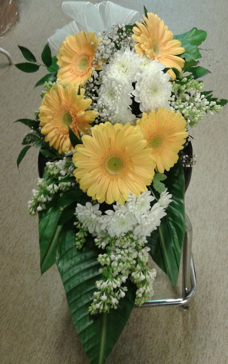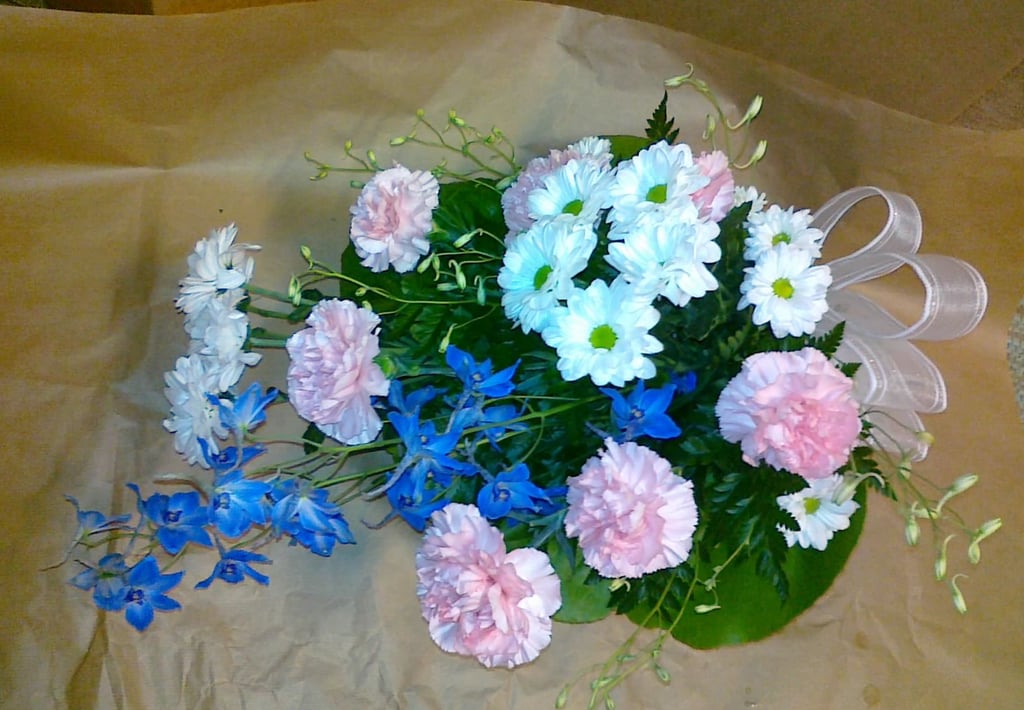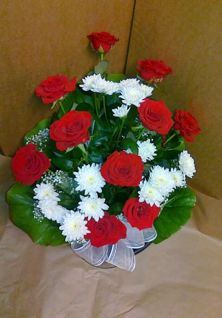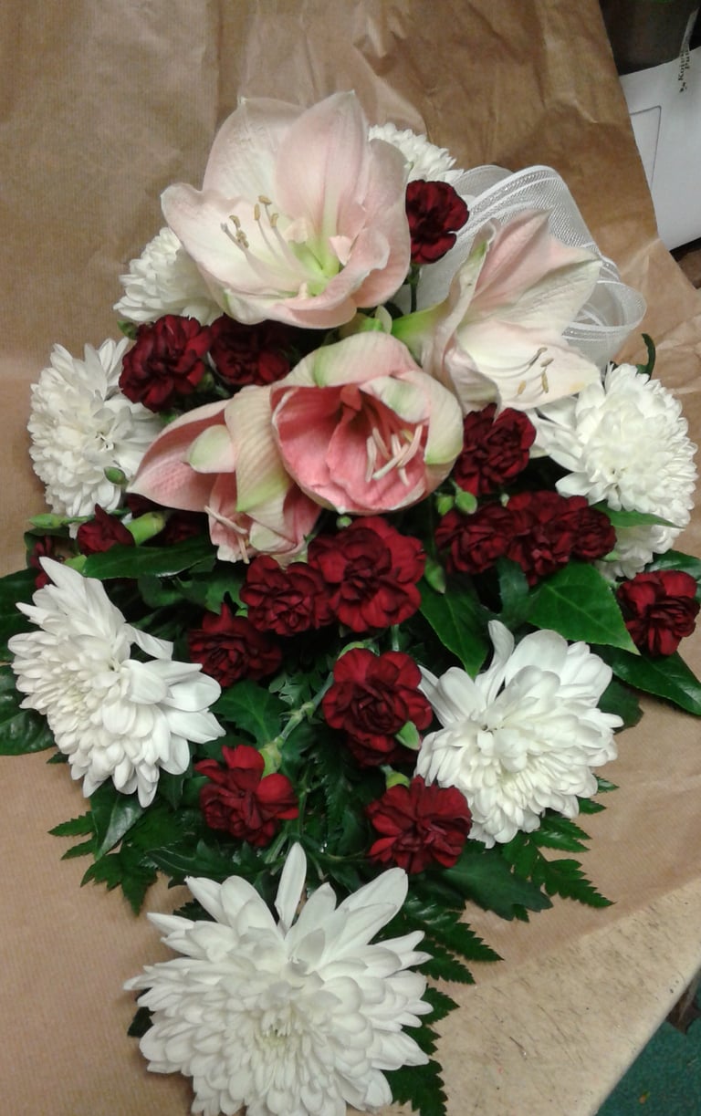 Kukkalaite sienipohjaan, krysanteemi, neilikka ja amaryllis.