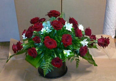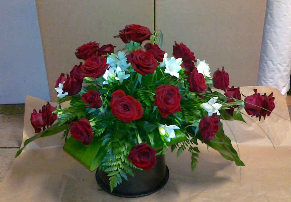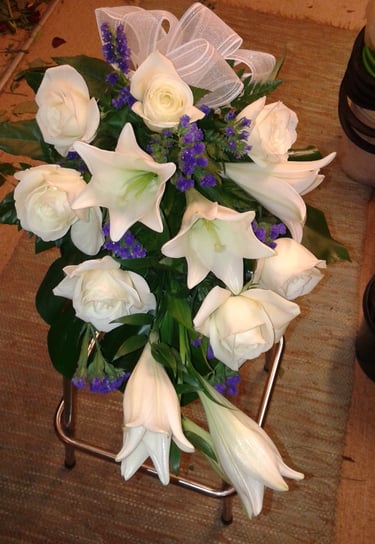 Kukkalaite sienipohjaan, valkolilja, ruusu ja ikiviuhko.