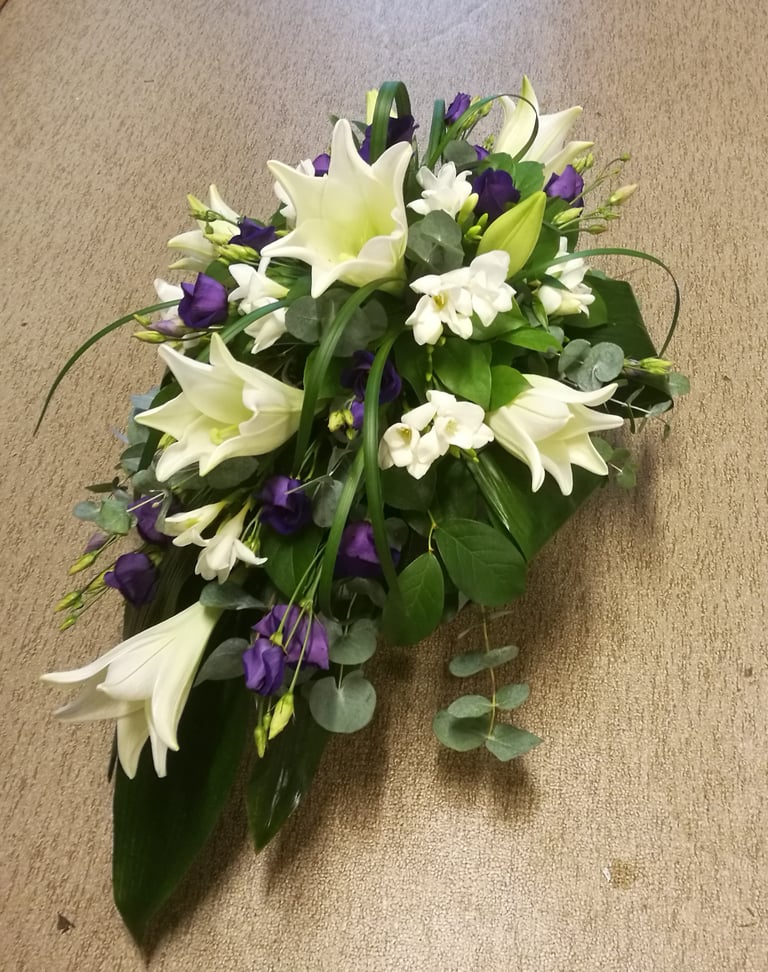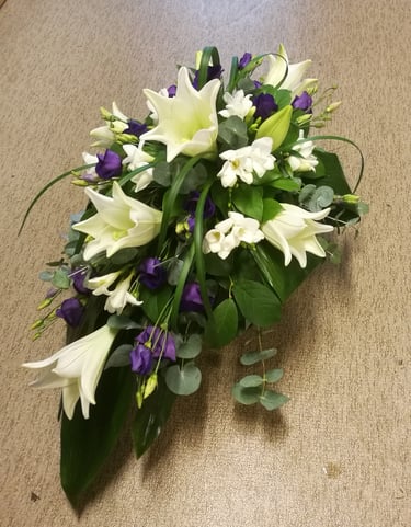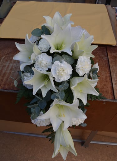 Arkunkoriste, valkolilja, eustoma ja freesia.