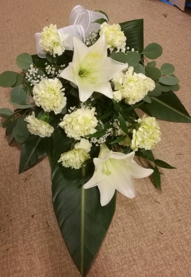 Kukkalaite sienipohjaan, valkolilja ja neilikka.