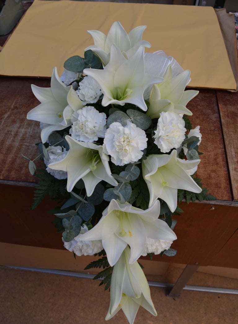 Kukkakimppu, valkolilja, neilikka ja harsokukka.