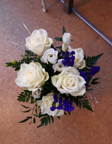 Kukkakimppu, ruusu, krysanteemi ja sinisarja.