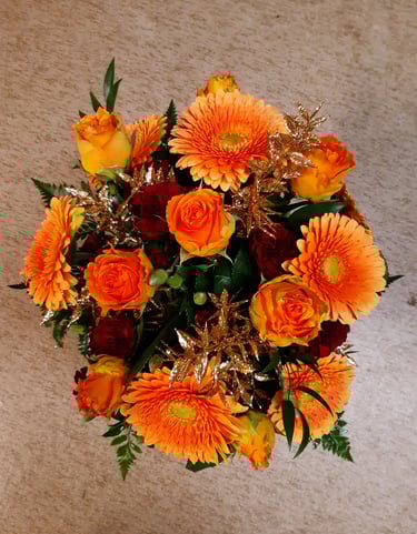 Kukkakimppu, ruusu, gerbera ja koristeoksa.