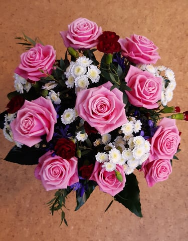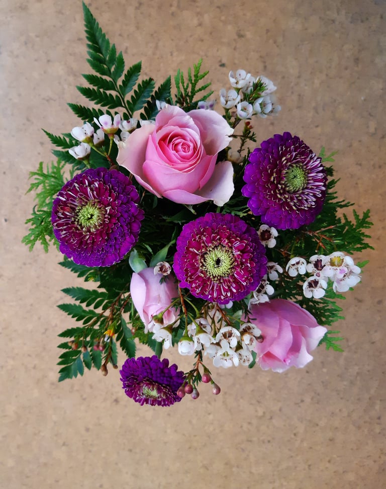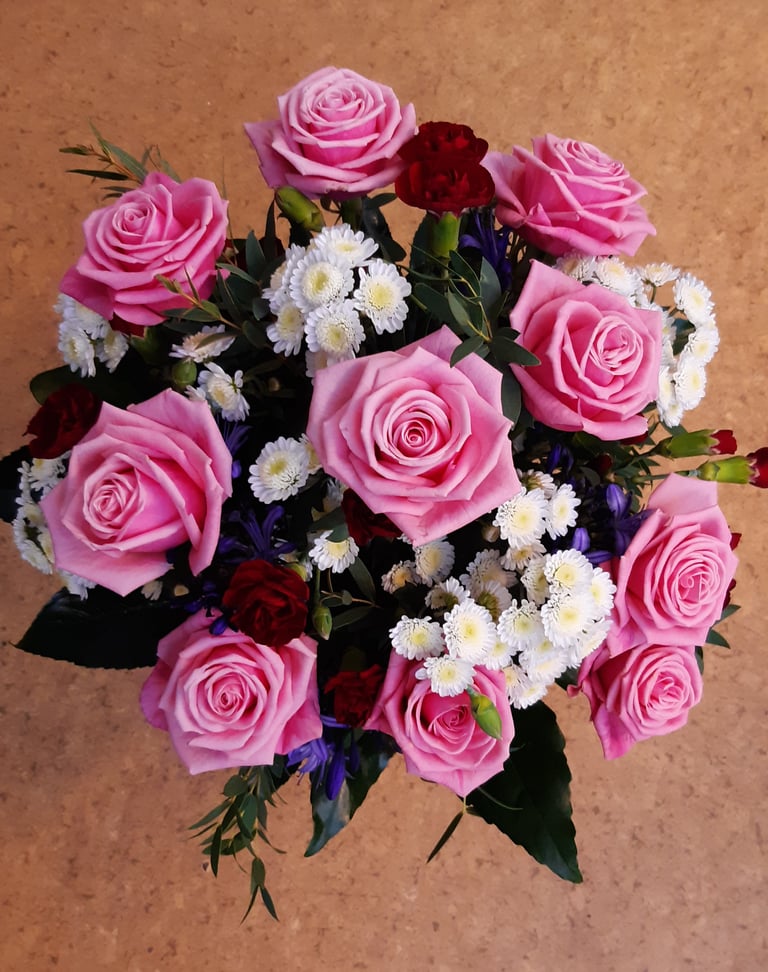 Kukkakimppu, ruusu, eustona ja ikiviuhko.