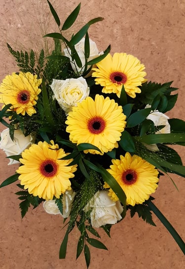 Kukkakimppu, ruusu, gerbera ja vahakukka,