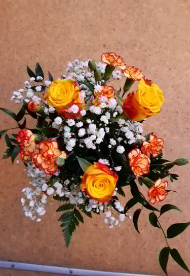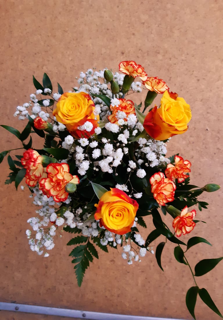 Kukkakimppu, ruusuneilikka ja harsokukka.