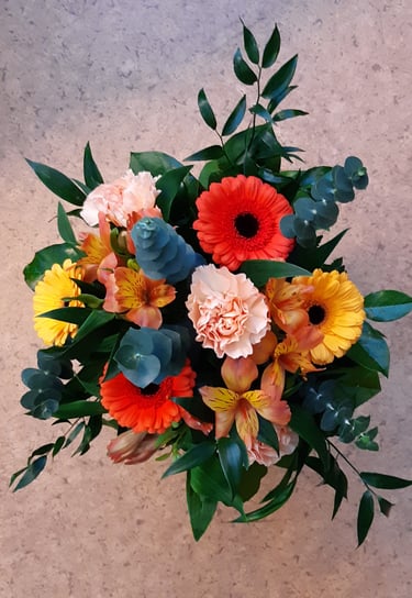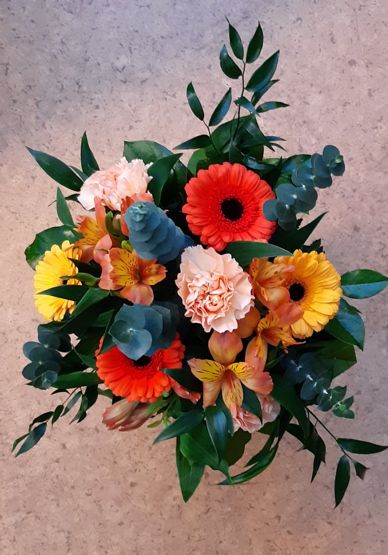 Kukkakimppu, gerbera, neilikka ja inkalilja.