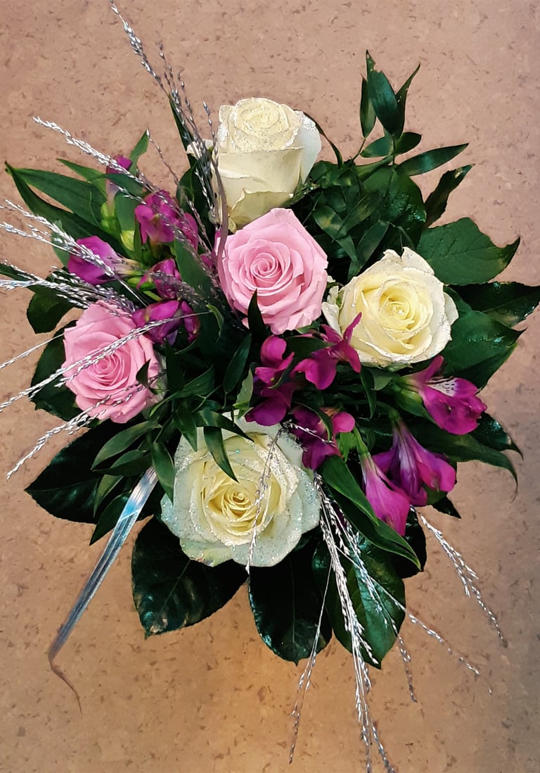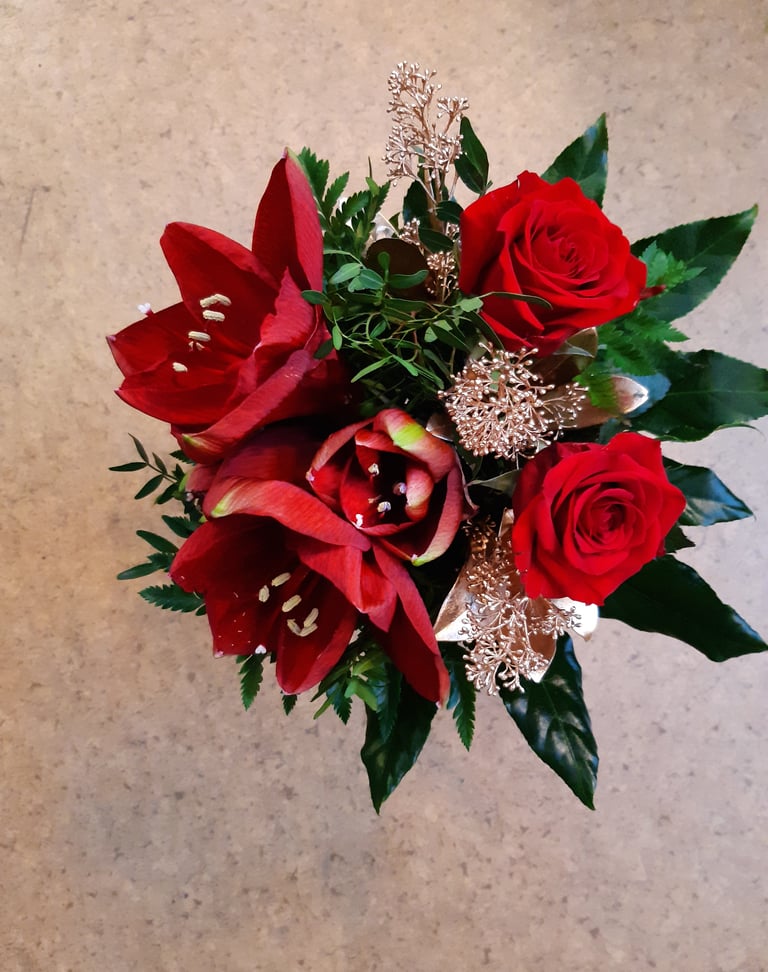 Kukkakimppu, amaryllis, ruusu ja värjätty skimmia.